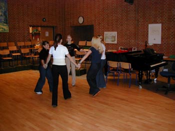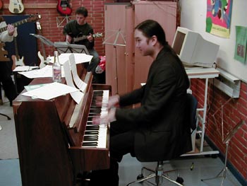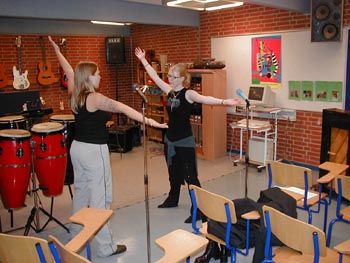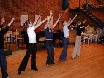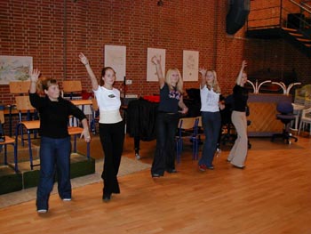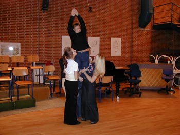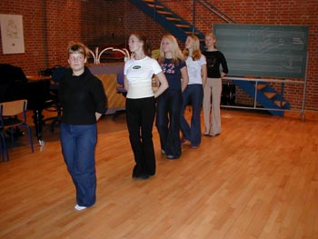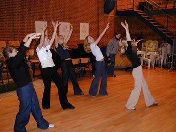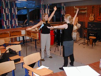 billeder ... fortsat (klik på billederne for at se dem større) (klik på NÆSTE/FORRIGE for flere) billeder fra d. 18 . 24/3 2001 Her ser vi en af de første prøver med hele showbandet. Bandleder Ronnie Olesen ved klaveret - iøvrigt Henrik Ravn (sax), Bjarke Nikolajsen (trompet), Reno Poulsen, klarinet), Thomas Andersen (trombone), John Skou (bas), Kristian Nielsen (guitar), Thomas Gundal (trommer) Vores koreograf Rikke Boisen (til højre) instruerer og kostumedesigner og chefsyerske Malen Jahn ser på Rikke herser med nogle unge kormedlemmer frem mod deres debut som dansere Et MEGET sjældent billede ..... Rikke ser i et kort sekund TRÆT ud!! Der arbejdes med ABBA-numre - "på den ene side ... eller på den anden side!?" - Anders/Al/Erling/Onslow kigger skeptisk på.